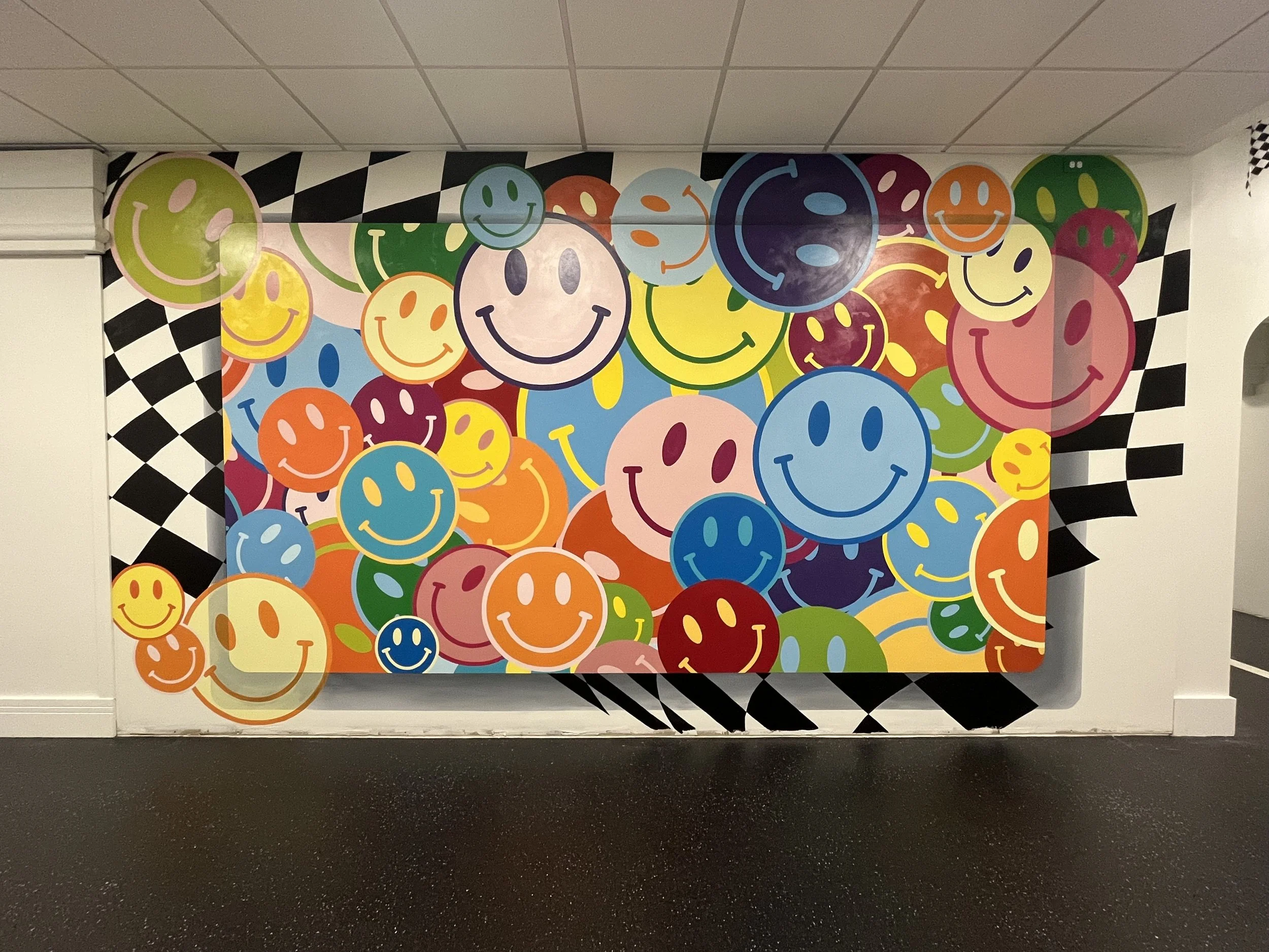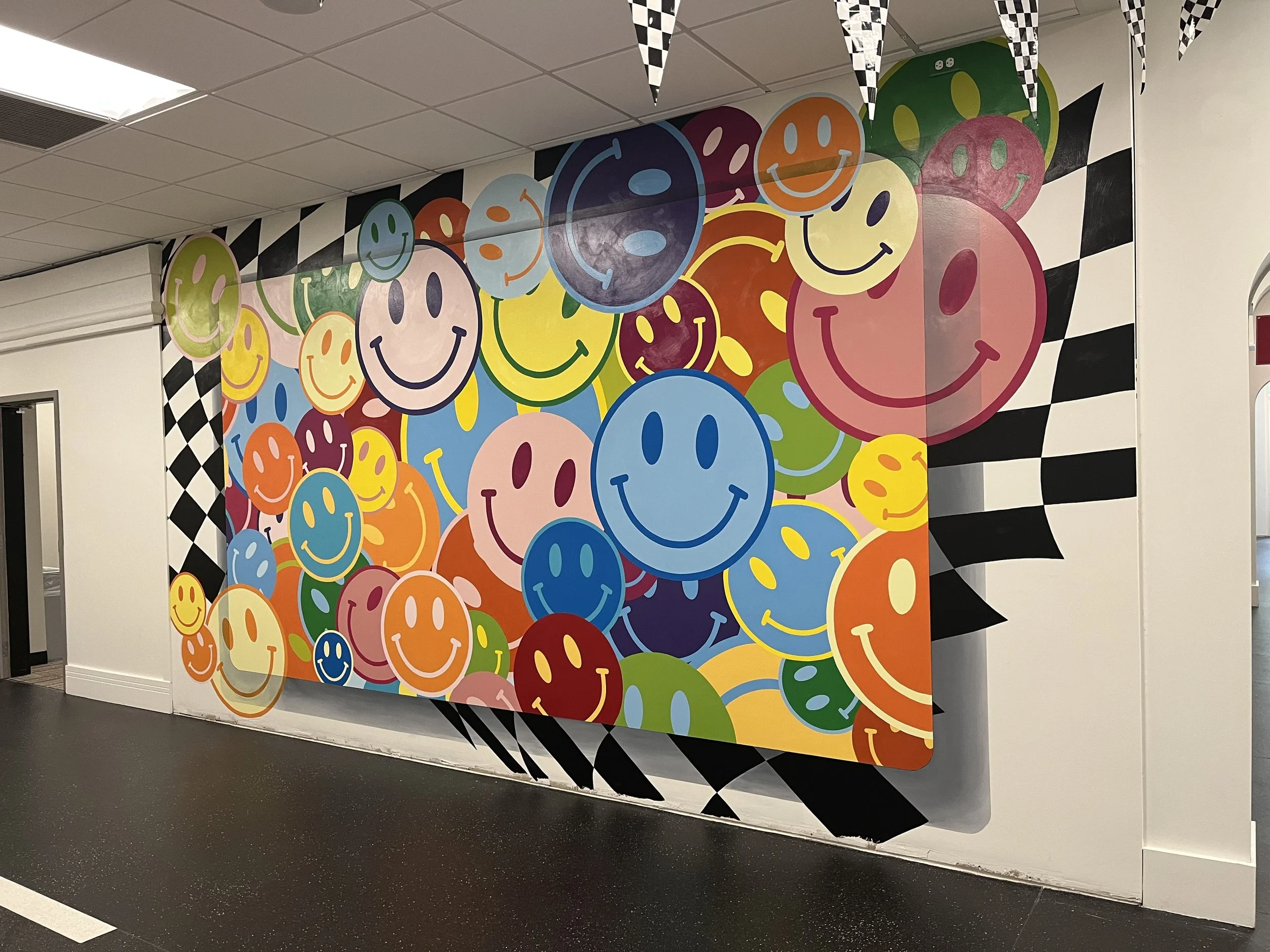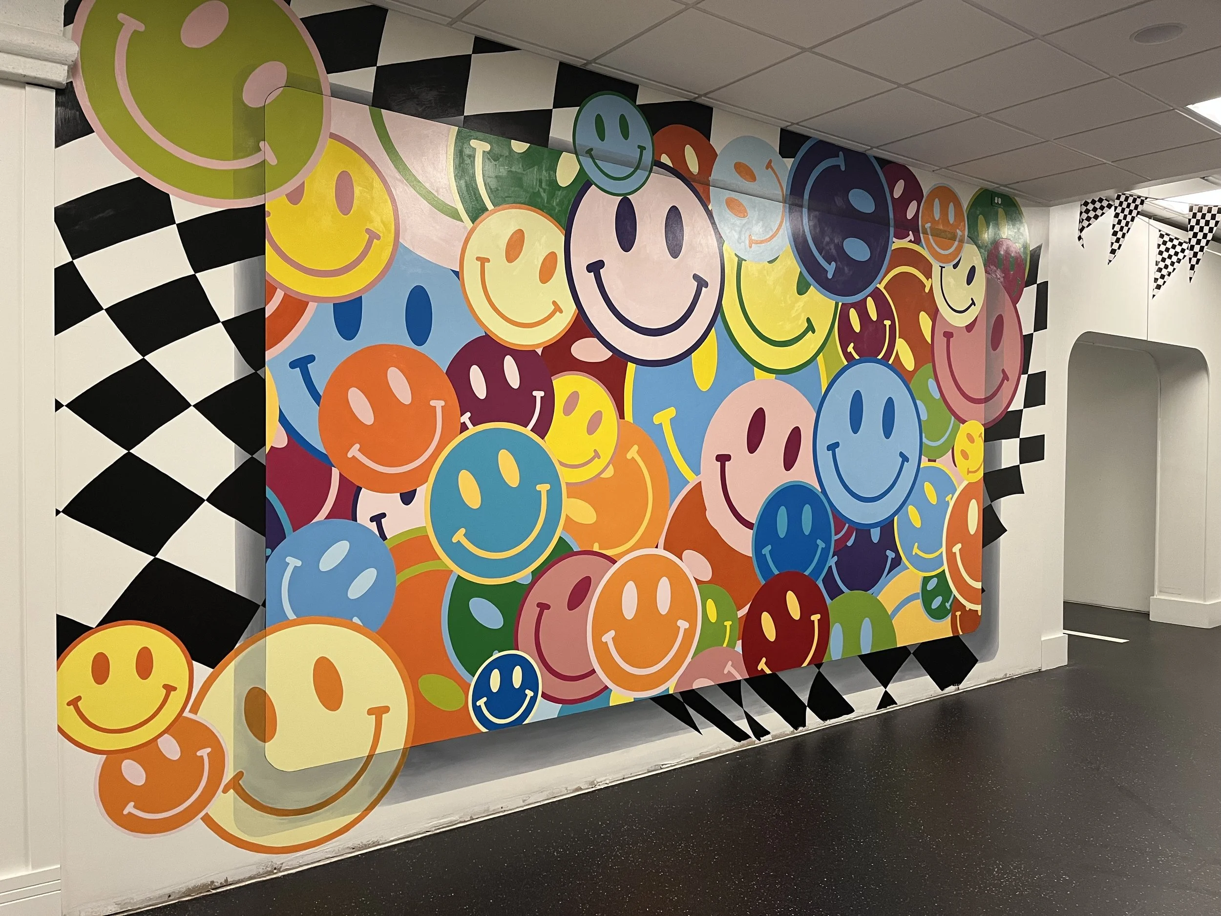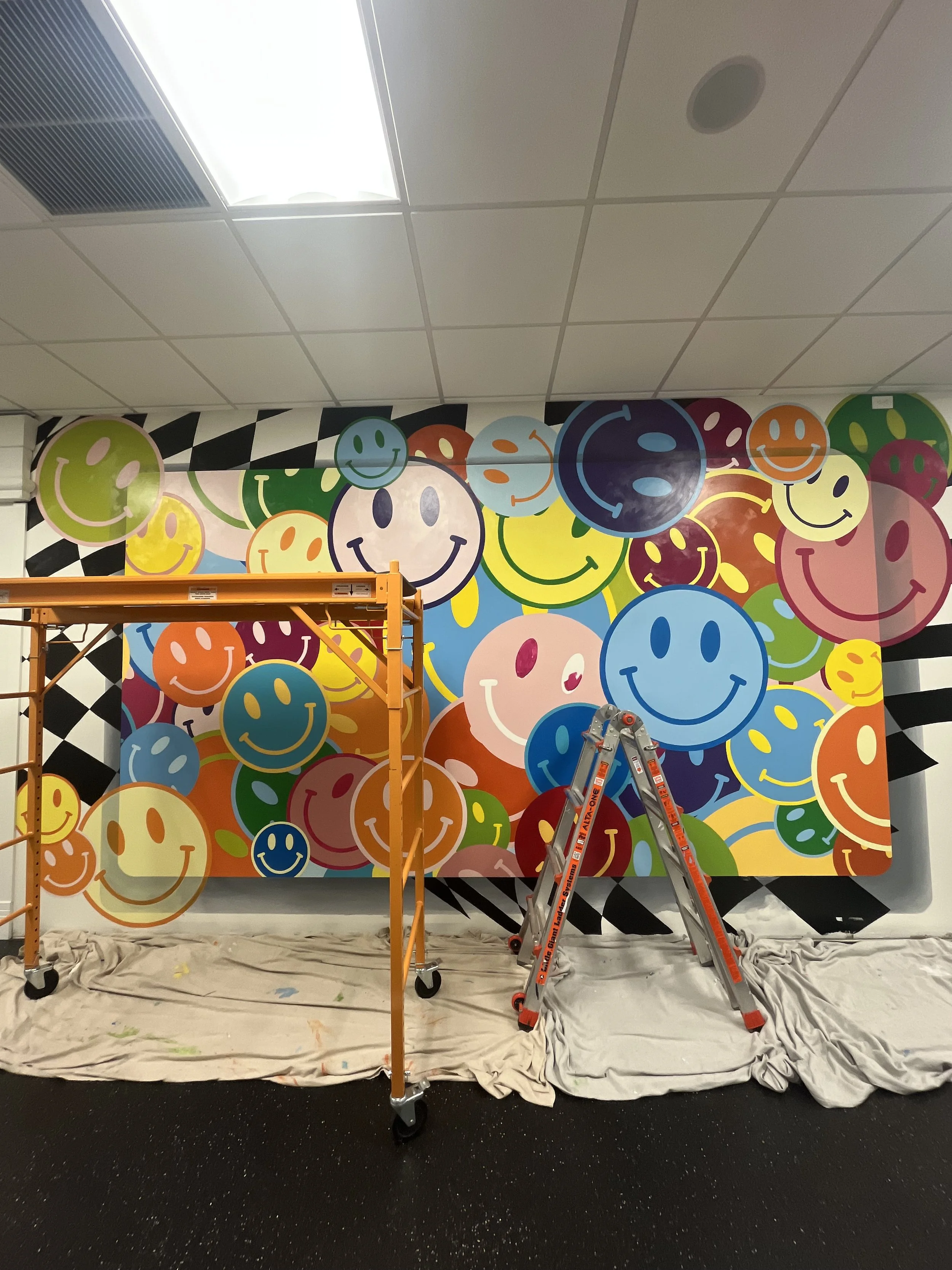To give the mural some fun depth, I designed a shadow behind the middle section. Painting the shadow was one of the toughest parts of the mural, but one of the most rewarding when finished!