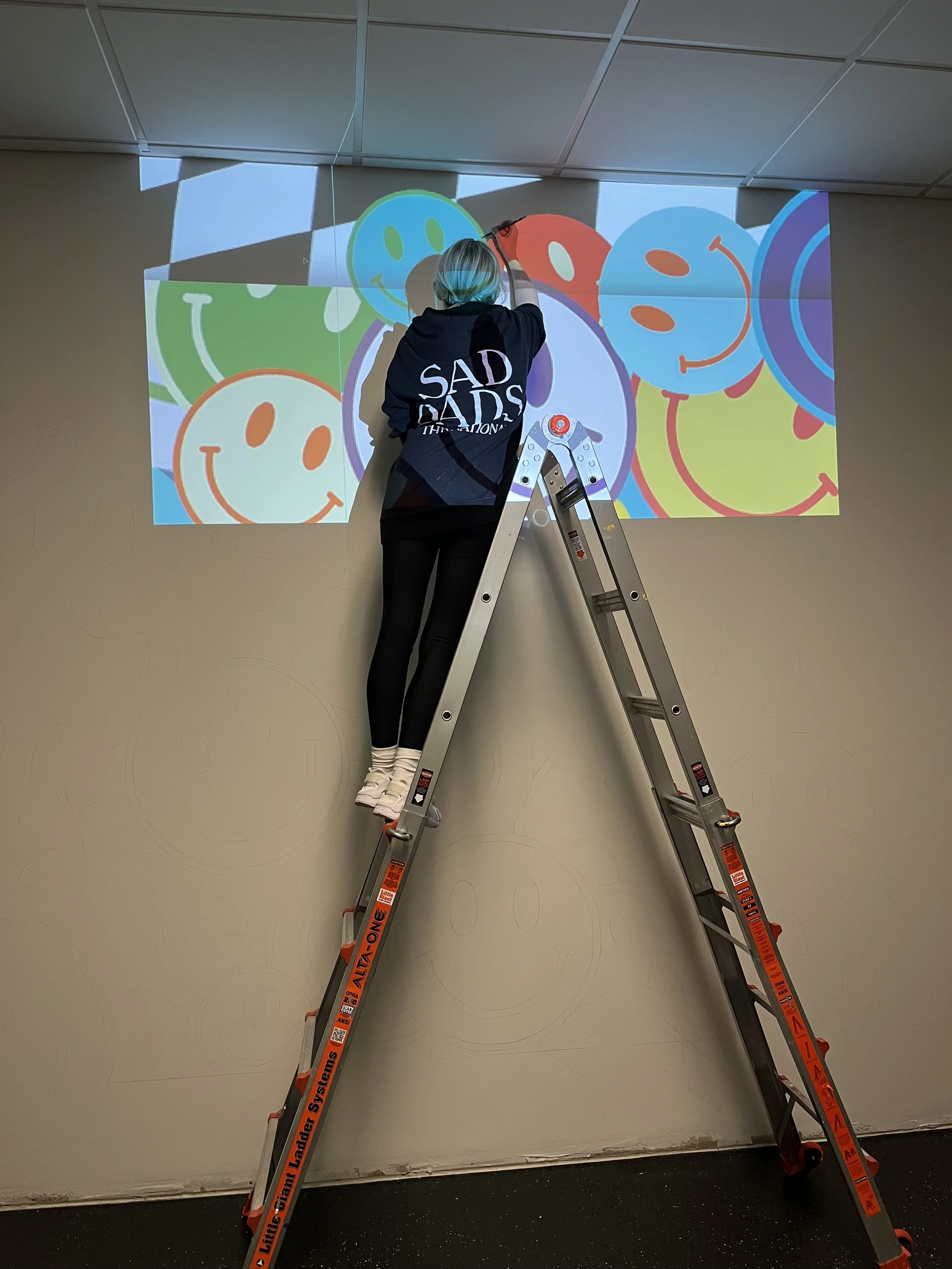 We projected the design in sections and traced it on the wall. Pictured here: Lindsay tracing the design with pencil.